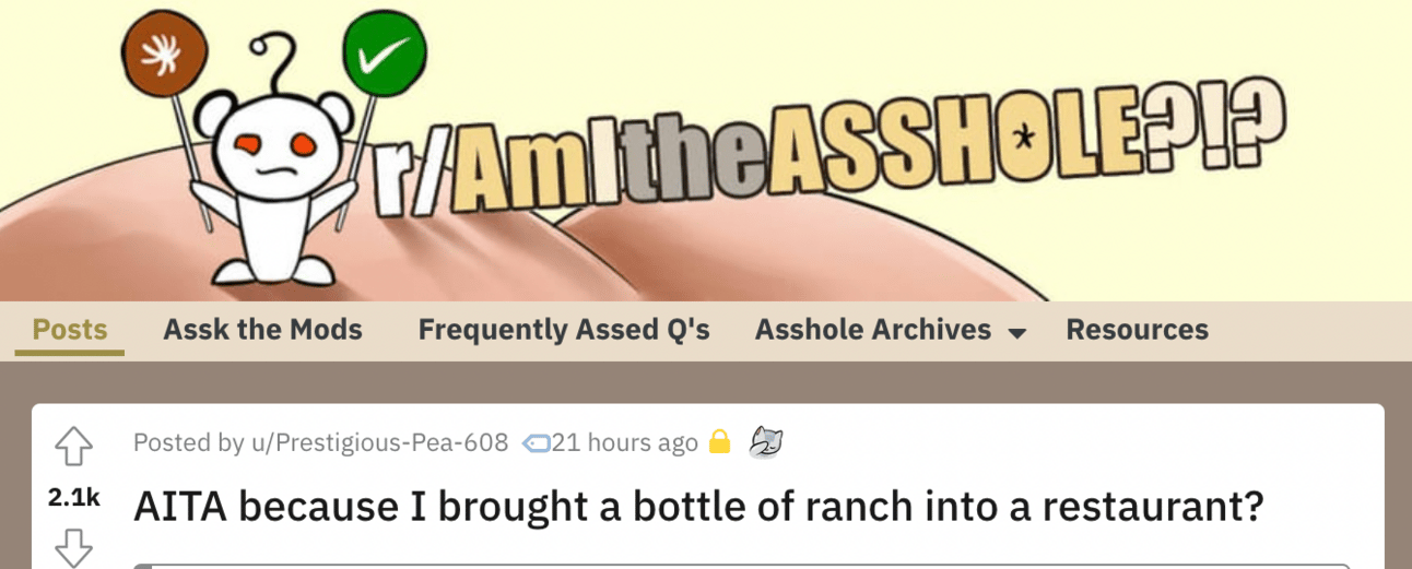 This has inspired a big discussion on both Reddit and Twitter and now I’d like to ruin your day with it, as well. The TL;DR is that a redditor went to a Polish restaurant and asked for ranch dressing. The restaurant did not have ranch dressing, so the redditor went out to buy some. Then got yelled at for bringing outside food into the restaurant. And now the redditor’s date isn’t really talking to them anymore.