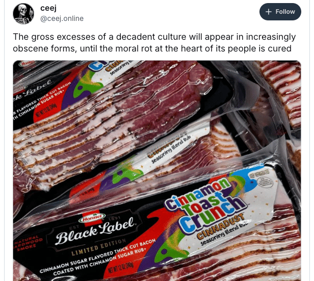 This was dropped in the Garbage Day Discord by odoyleghouls. I would try the Cinnamon Toast Crunch bacon.