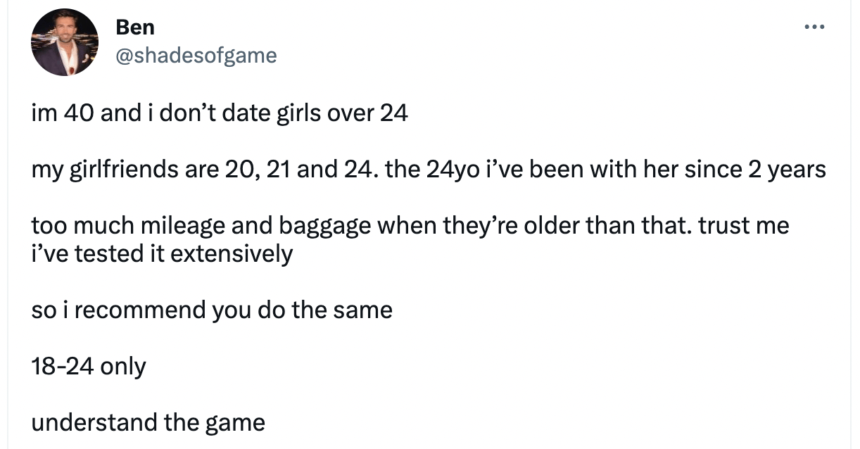 Over the weekend, a pickup artist that goes by @shadesofgame tweeted that he’s 40 years old and he only dates girls under the age of 24. Yikes! He then posted two photos of himself with said women under the age of 24.
