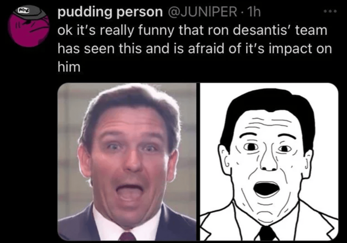From the very beginning of Meatball Ron’s political ascendence, he has been defined both by Trump and in opposition to him. There’s no better example of this than the “Make America Florida” tagline that started going viral back in 2021. But you can also clearly see DeSantis trying to emulate Trump by picking a fight with Disney and passing insane moral panic legislation in step with headlines from right-wing media. But, as perfectly captured by DeSantis’ team’s fear of his weird self-conscious face inspiring memes, DeSantis isn’t Trump and has no idea how to be Trump and seems to be missing a fundamental understanding of what Trump was even doing and why.