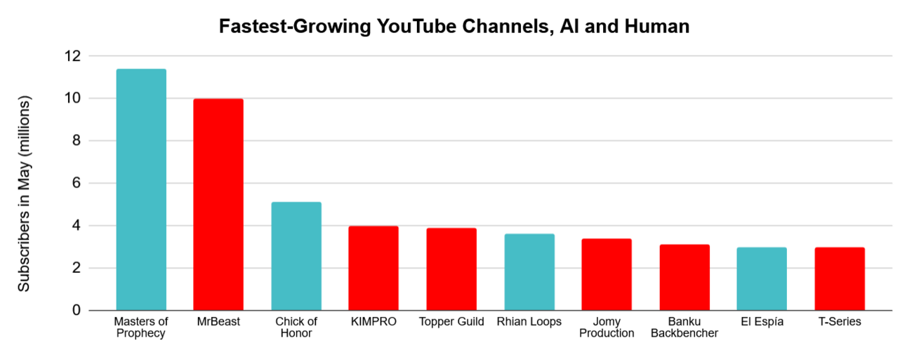 It’s how we know about Catholic Fundamentalism, the single-largest publisher on Facebook in 2020s, larger than the BBC or The New York Times, even though it’s just a blog run by a retiree from Pittsburgh. It’s why we didn’t fall for the mass panic over TikTokers stanning Osama bin Laden, because we actually know what the most viral content on TikTok is every month. It’s how we spotted Stanley Cups nine months earlier than the rest of the media. And it’s how we know that AI-generated YouTube channels are overtaking MrBeast on Youtube, even as the platform claims they’re demonetizing AI content.