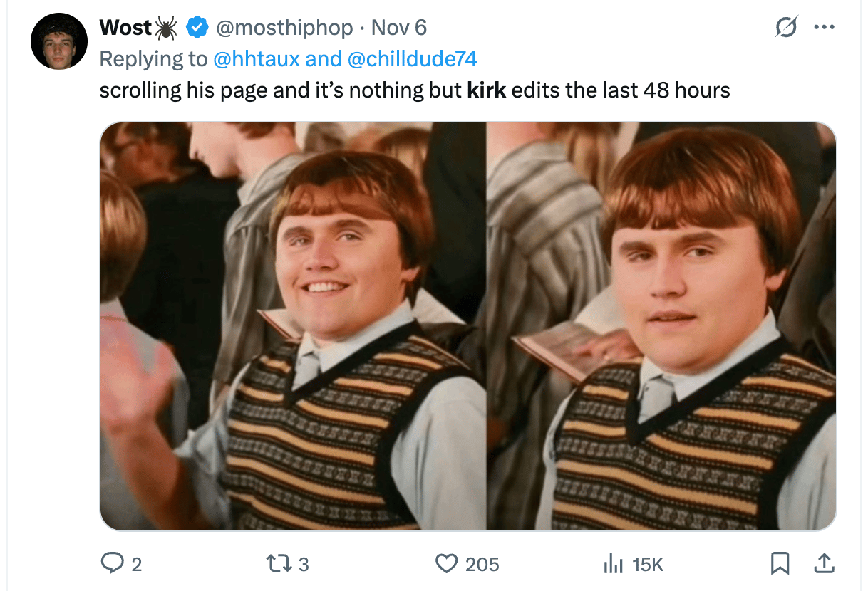 The main account pumping out Kirk edits on X right now is @chilldude74, who is going very very viral putting Kirk’s face on rappers and black athletes. Dissecting exactly how racist this all is is a little tricky, but it’s happening on X, so it’s safe to assume there’s a dimension of it at play here.