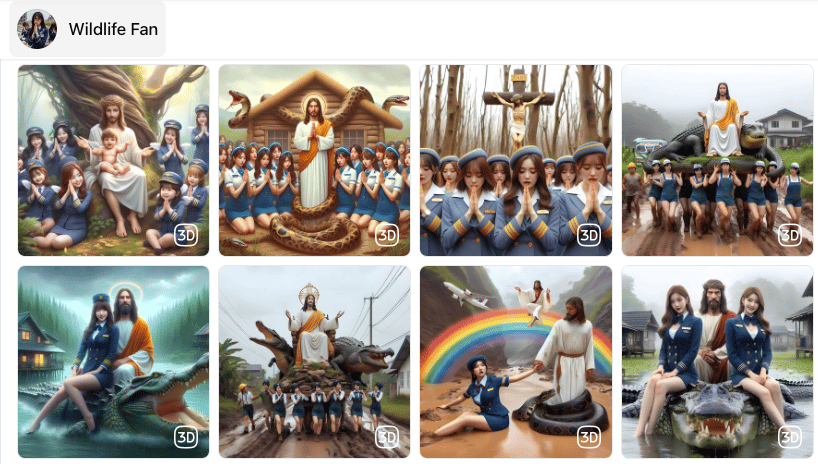 I assume these pages are simply jamming a bunch of popular stuff together to farm engagement to eventually monetize in some way down the line. Why AI images? Because you can flood Facebook with thousands of posts and the platform won’t really do anything about it. These pages are also using the platform’s built-in 3D photo filter, possibly to bypass Facebook’s bar-is-in-hell bare-minimum AI image detection. Why flight attendants? Because Facebook users are, and always have been, uncontrollably horny. But, also, my mom is a flight attendant (sorry mom if you’re reading this!) and aviation and flight attendant Facebook has always been huge. So I think they’re just identifying communities that were already active and swarming them. Why Jesus? Because religious content — and getting users to say “Amen” underneath it — became one of the fastest growing types of content on the site after it stopped promoting news content last year.
