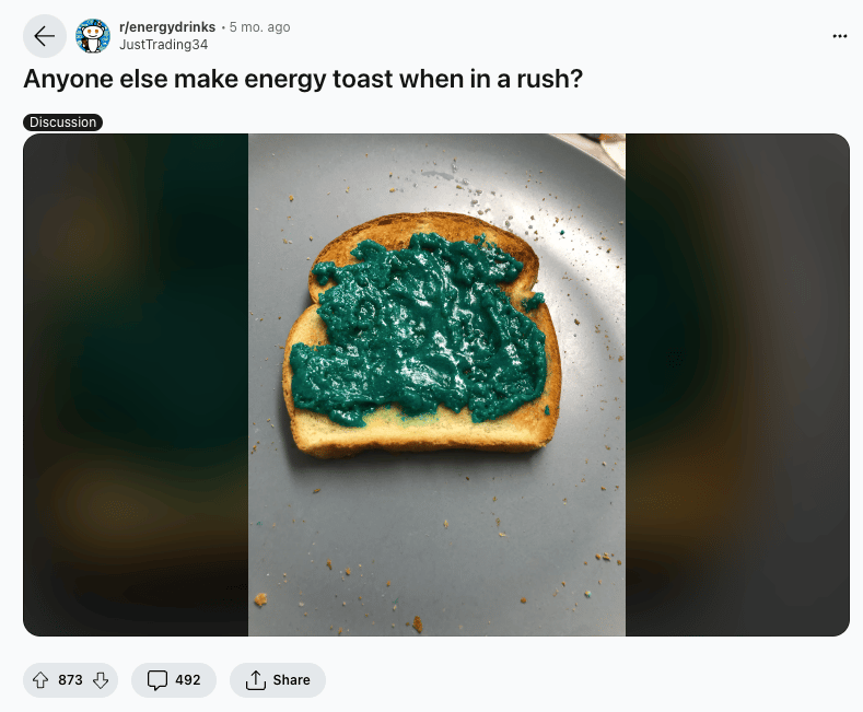 I saw a screenshot of this on X recently and hoped that by finding the original post on Reddit I’d get a few more answers about what’s going on here. It was posted in r/energydrinks, so I assumed “energy toast” is toast with a jam made from some kind of melted down energy drink, but I was curious which. Down in the comments, the original poster said it was something called “C4 jelly,” which I found a recipe for on Instagram. I guess, it’s jelly made from an energy drink called C4.