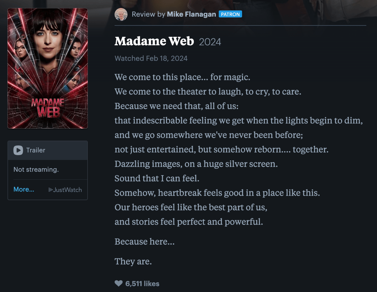 Horror director Mike Flanagan wrote an extremely good review of Madame Web on Letterboxd. Also, it’s genuinely very exciting to watch Madame Web turn into a new camp classic. It’s webbin’ time, baby.