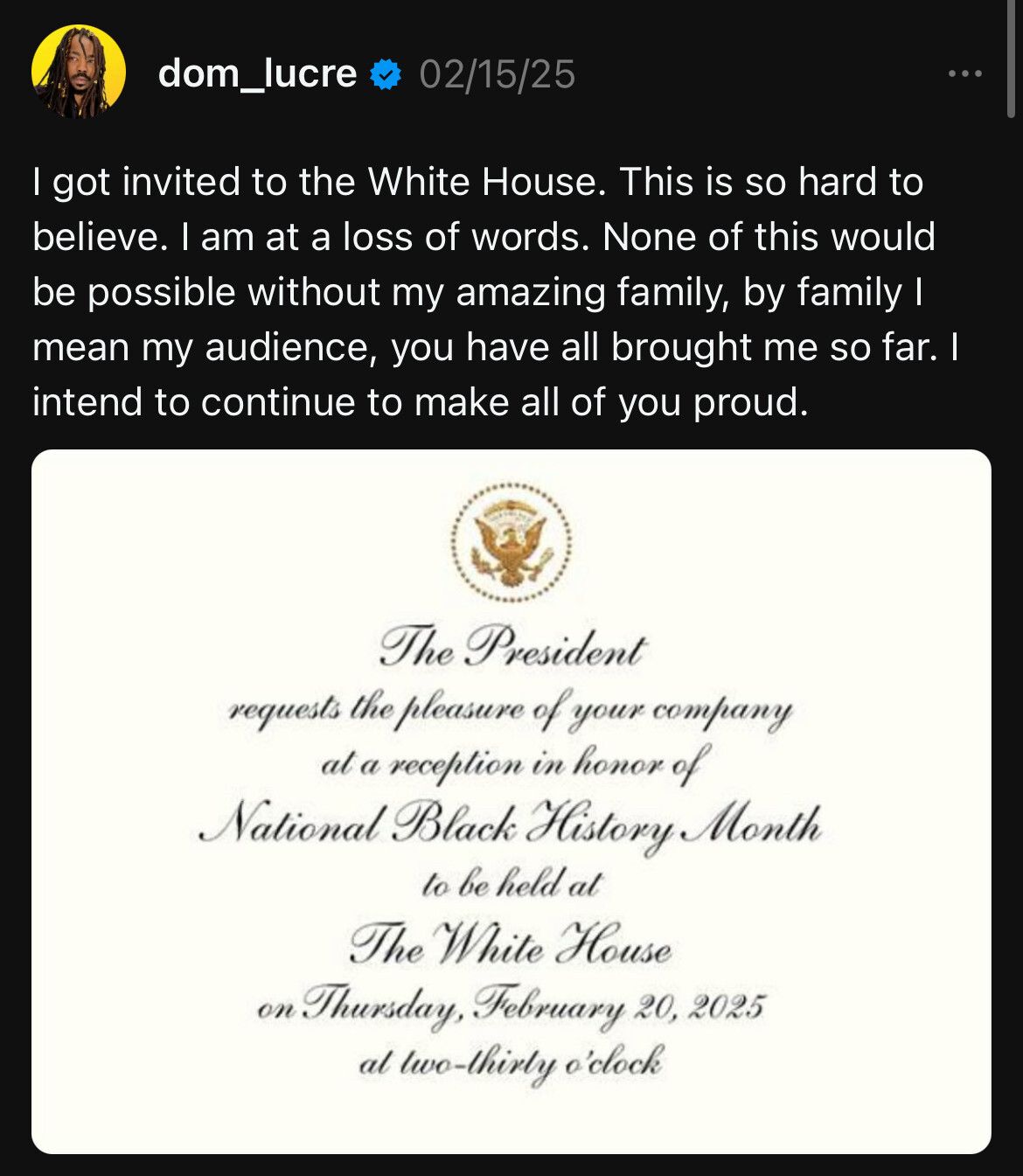 Here’s something I completely missed from last month. Dom Lucre, a hugely popular QAnon influencer, was invited to the White House for a Black History Month celebration. This was noticed by Faine Greenwood, journalist and Bluesky power user.