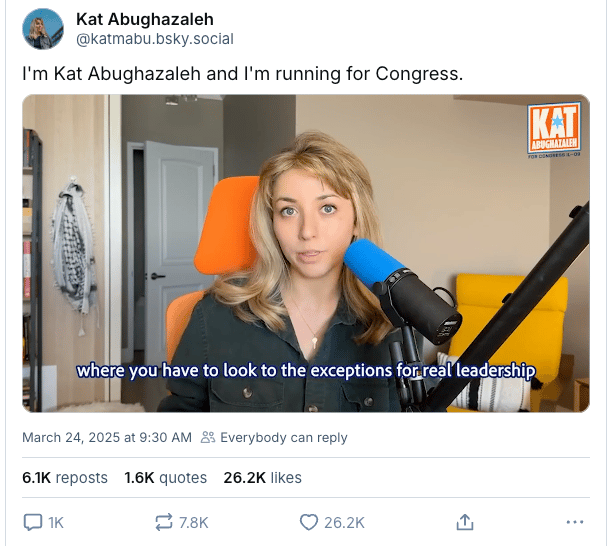 Anyways, Abughazaleh wrote a really interesting thread on Bluesky today outlining why she’s focusing on the platform for her campaign. “On Bluesky, I don’t have to give anyone $8, language doesn’t have to be self-censored, and links aren’t deboosted to hold users hostage on the site. That’s a plus in my book,” she wrote.