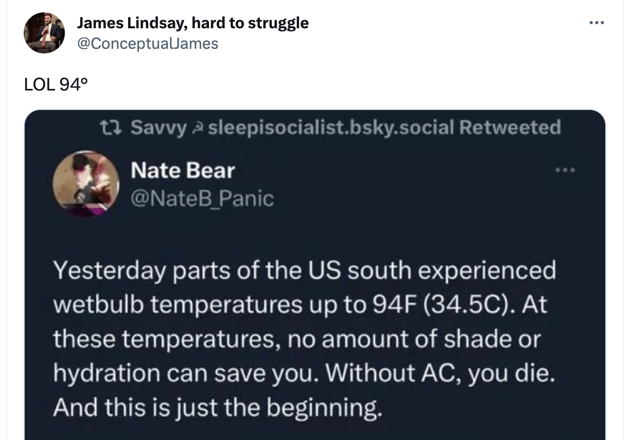 I suppose it shouldn’t shock me that right-wing influencers are acting like extreme heat isn’t actually that extreme. It’s sort of the entire philosophy behind climate change denial. But I guess I just assumed that if the weather became extreme enough, at the very least, we could all agree that it was, in fact, extreme.