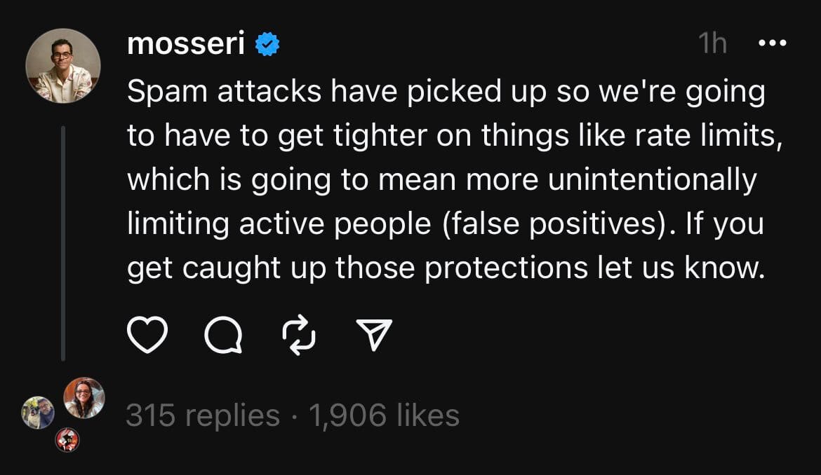 Instagram (and Threads) head Adam Mosseri announced this week that spam has overtaken the platform — I’m curious how Meta differentiates spam from the normal content that its biggest users are regularly posting. And so, to combat this, Threads is being rate limited.