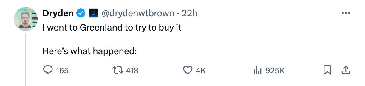 Praxis is a project led by Dryden Brown and Charlie Callinan, who have raised A LOT of money to build what they’re calling “the first network state.” And Brown recently shared a very long and deranged thread on X about how he went to Greenland on a fact-finding trip to buy the country. As Brown wrote, “If humanity is going to build Terminus on Mars, we should practice in Greenland. It can serve as a sandbox for terraformation experiments, funded by realizing its potential as a mining and industrial hub.”