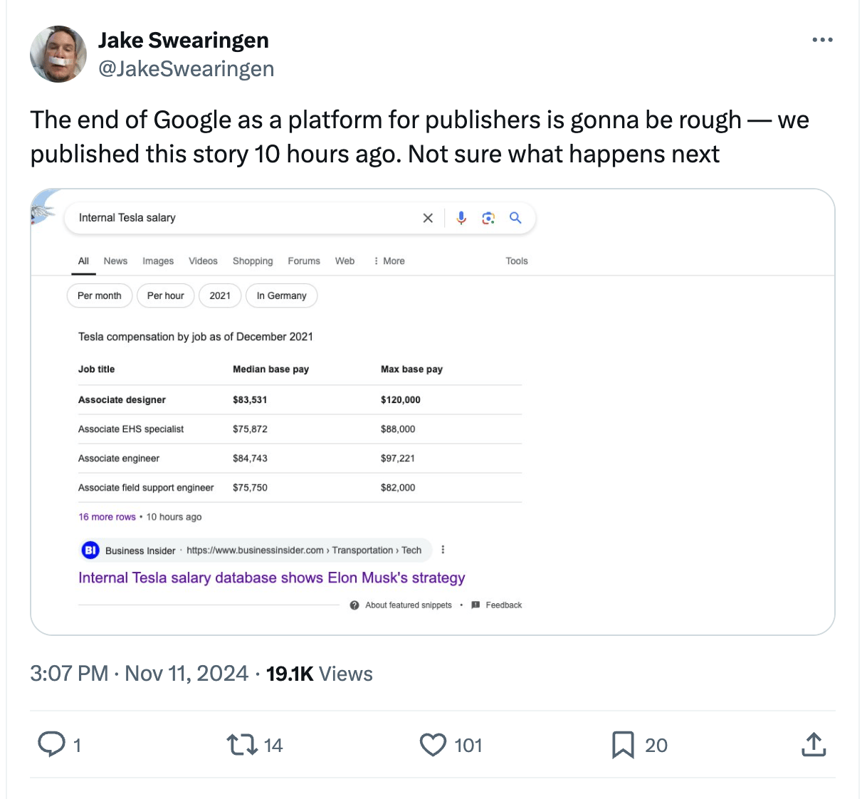 Business Insider Deputy Editor Jake Swearingen share a screenshot of a Google snippet pulling out all the relevant information of an article Business Insider had just published. Now, to be clear, this is not a Google AI summary. But it is part of Google’s wider AI-driven push to cannibalize their own links. And, as Swearingen soberly wrote, “The end of Google as a platform for publishers is gonna be rough.” Especially because, at this point, Google is the only way a news organization can stay afloat now that the Facebook traffic hose has been turned off. Speaking of Facebook, though…