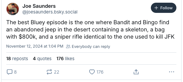 And, while some of Bluesky’s recent pop off is due to MSNBC’s Chris Hayes plugging it on air this week, there are other factors at play, as well. The two biggest, as far as I can tell, being that Musk’s proximity to the incoming Trump administration now makes X an official propaganda organ of the American right and journalists are finally accepting that Threads sucks shit. Garbage Day is not always correct, but we were correct about Threads on day one.
