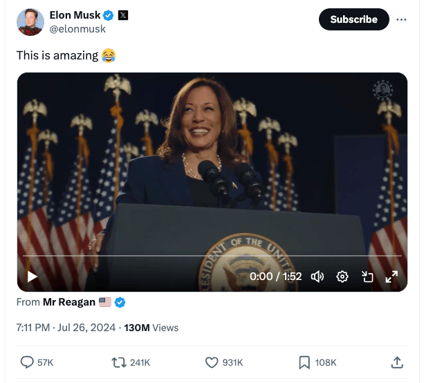 Over the weekend, Elon Musk shared a video featuring AI-generated audio of Vice President Kamala Harris, which has now been “viewed” 130 million times. The video originally came from an account called @MrReaganUSA, where it was “viewed” an additional 15 million times. That account belongs to a right-wing YouTuber named Christopher Kohls who, I guess, pretends to be Ronald Reagan online. Normal.
