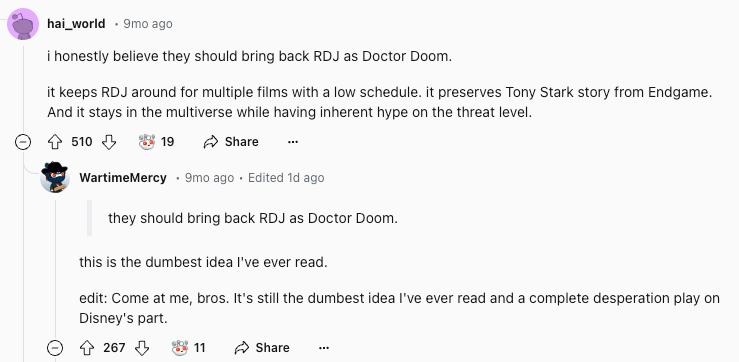 Nine months ago, a redditor named u/hai_world, in a thread on r/boxoffice, predicted that Marvel would bring back Robert Downey, Jr., to play Doctor Doom. And this weekend, at San Diego Comic Con, Marvel announced just that (I don’t want to talk about it).