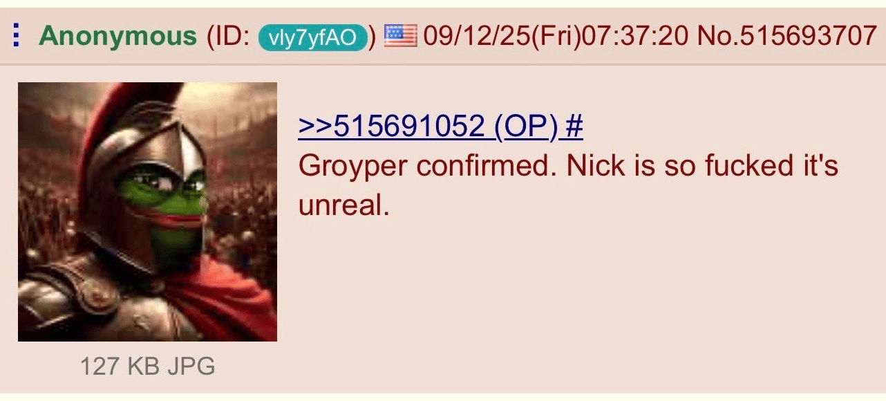 It’s also possible Robinson genuinely believes in antifascist principles. But his alleged use of random internet brainrot is notable. Many extremism researchers this morning are wondering if Robinson is a self-identified “groyper,” or follower of far-right streamer Nick Fuentes. As we wrote yesterday, Fuentes has spent years attacking Kirk online. Groypers believed that Kirk was a sellout and blocking a much more extreme version of Trumpism from taking root. For years, Groypers have been carrying out what they call “Groyper Wars,” attending Kirk’s events and trying to disrupt them. For what it’s worth, 4chan users think Robinson was a Groyper.