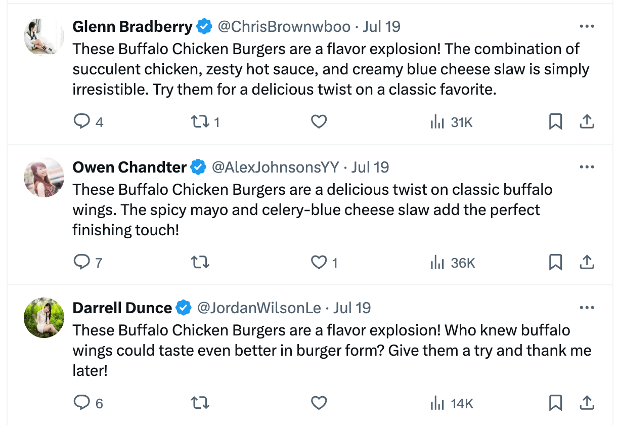 There’s an account on X called @goksuuuuul that seems to almost exclusively post AI-generated recipes with basic stock photos. And last week, they posted a recipe for “Buffalo Chicken Burgers,” that really caught the attention of the site’s vast network of bots. The replies underneath it are all some variation of this: