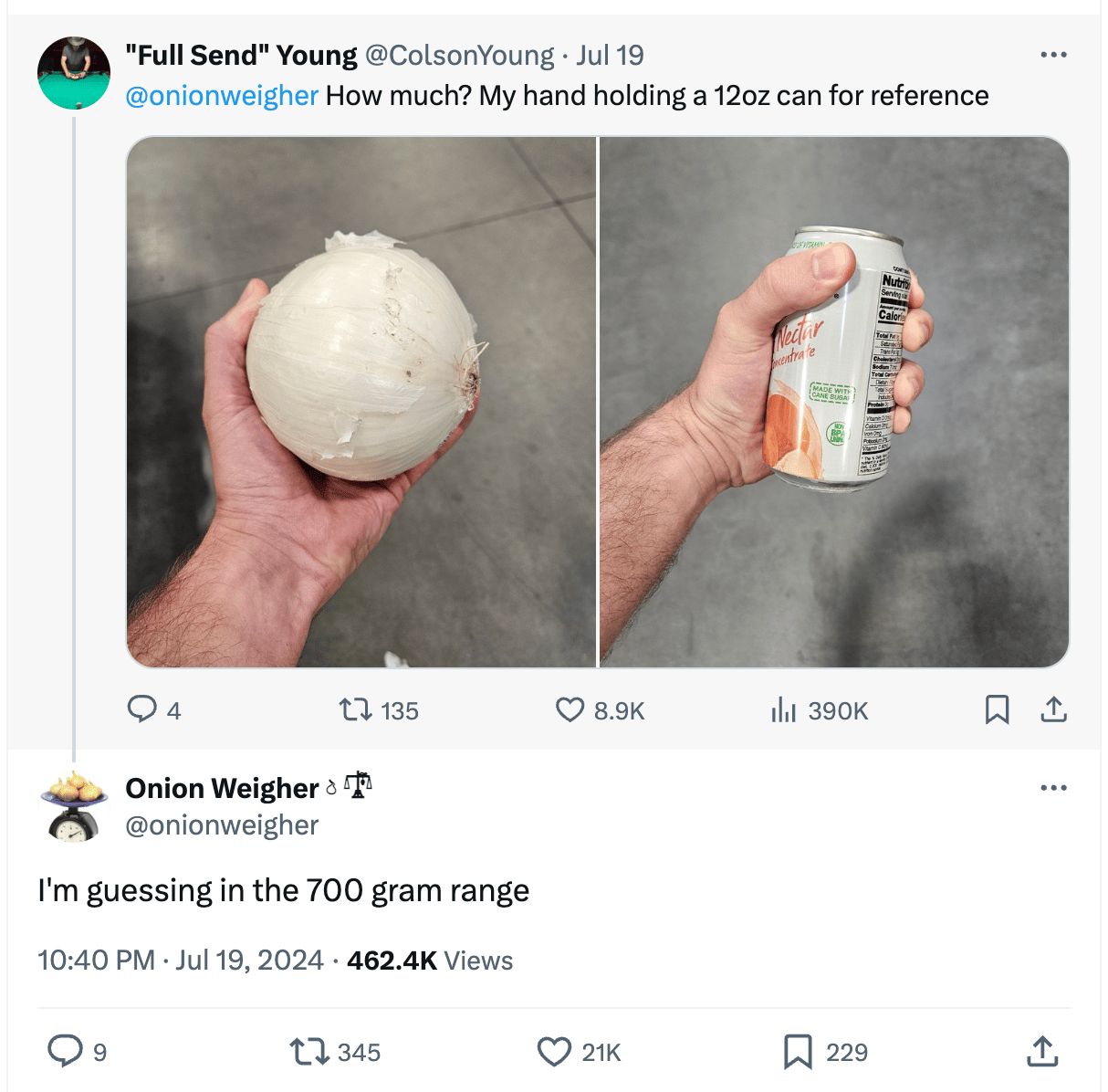 Well, @ColsonYoung weighed the onion and guess what? It weighed approximately 700 grams. Incredible stuff, as always.