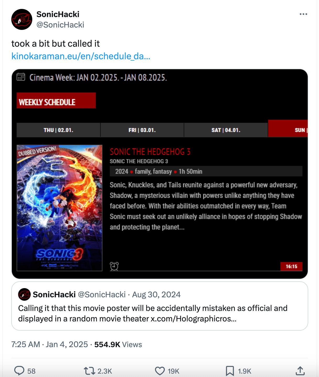 Well, it was bound to happen. Over the summer, Sonic fans photoshopped the Sonic 3 poster to make Sonic and Shadow kiss. Obviously. The photoshops started circulating around the web. And, over the weekend, a movie theater in Croatia accidentally used one of the photoshopped posters instead of the real one on their website. A story as old as time.