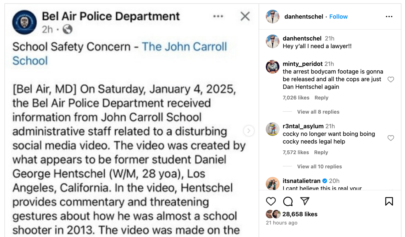 Online performance artist and comedian Dan Hentschel — you probably know him as the guy on X constantly screaming in his car — is apparently in hot water after recording a video about wanting to shoot up his high school in 2013. It seems like this is the video that law enforcement are now investigating. Like with a lot of Hentschel’s work, there isn’t an obvious punchline in it, but if you watch enough of his videos, you do start to get the kind of satire he’s doing.
