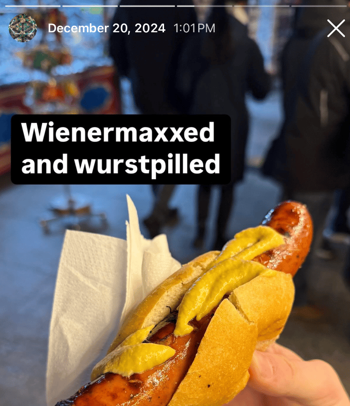 Unbeknownst to me, a man had just driven a car through a Christmas market in the German city Magdeburg, which American media was reporting as Berlin (It’s about two hours south). And the reason my loved ones were panicking was because my most recent Instagram Story was this: