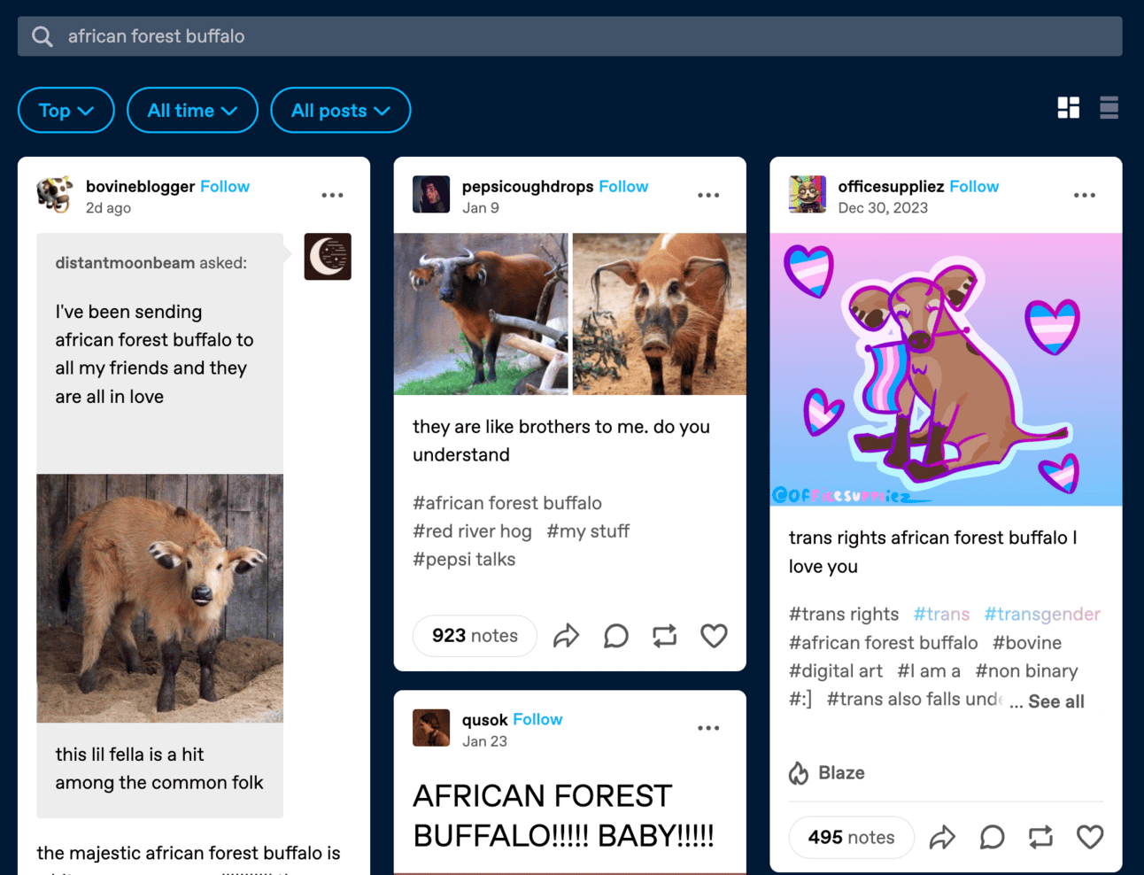 I was trying to figure out why the African forest buffalo was going viral on Tumblr right now, but I think I’m actually more confused than I was. The post that appears to have kicked it off was this one, which doesn’t make a lot of sense, but, hey, what on Tumblr does. If I had to guess as to why users like this breed of buffalo so much right now, I’d guess it’s the ears. Which are very fun.