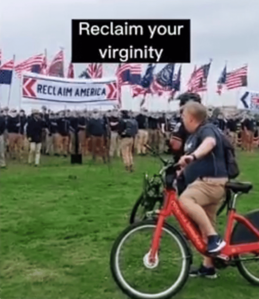 Click here to see the video (because Twitter embeds are still broken). Thankfully, users found the guy heckling Patriot Front in the video. His name is Joe Flood and he has a delightful thread about his afternoon following Patriot Front around DC.