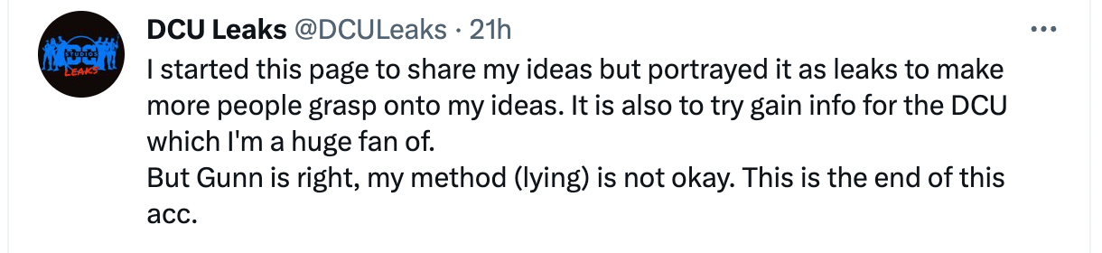 Yesterday, Gunn replied to @DCULeaks directly, writing, “Maybe you’re having a difficult time in life and lying for attention is how you get solace. But please find a better way.” And then after a bit of back and forth, the person behind @DCULeaks just dropped the bit and admitted the whole account is full of bull shit.