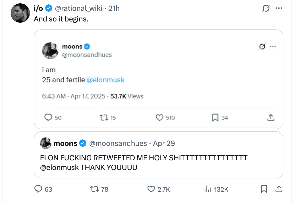 We live under a geopolitical order that you could argue would look completely different without a mean article in Gawker about a tech CEO and a very factual and logical Harry Potter fanfic. The biggest beneficiary of this order, the richest man in the world and loser of a feud with Asmongold, may step back soon from using the misspelled meme of a dog as his official seal of taking control of the United States government. If he does leave to spend more time DMing women to have his babies, he'll cede control of the world’s third-largest military to a series of groupchats, where bombings are met with thumbs-up reacts. Maybe they'll have an advantage in a global conflict where the biggest ongoing risk to military infosec is the forums for an MMO.