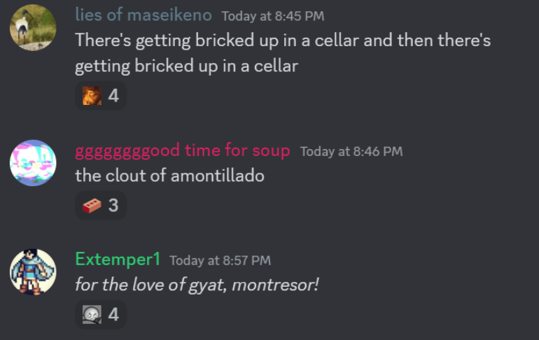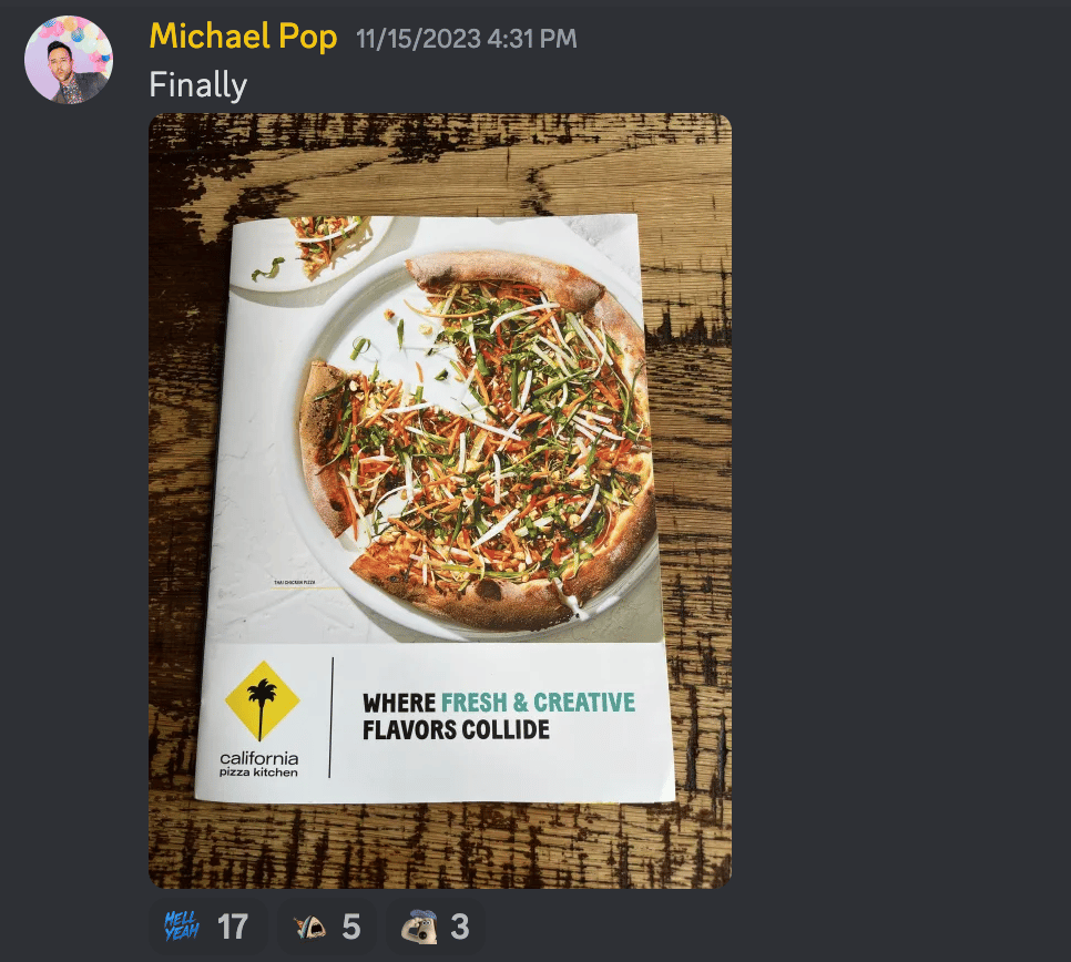 This one is a bit tricky to explain, but, essentially, a user in the Discord named Michael was pestered for months to go to California Pizza Kitchen. Last month, he finally went. Except he didn’t actually get pizza. He got tortilla soup and jambalaya, apparently. Either way, it was a big moment on the server this year and, I realize while writing this, completely indecipherable to outsiders. Welcome to the new internet! As user cissy wrote, “I'm worried about the lesson we've all learned about how internet bullying is good actually.”