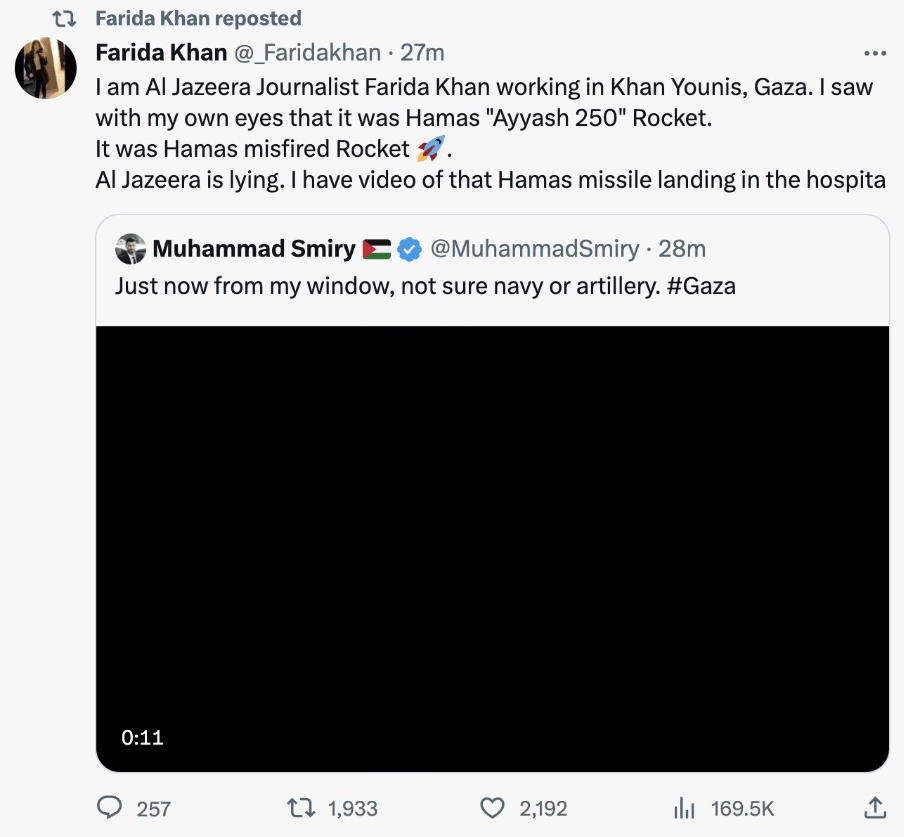 Related to the general noxious vibes on X that I wrote about above, an account called @_Faridakhan went viral this week after it claimed to be an Al Jazeera reporter. The account posted that Al Jazeera was lying about the reported bombing of a hospital in Gaza and, obviously, was reposted thousands of times — including reposts from accounts that should absolutely know better.