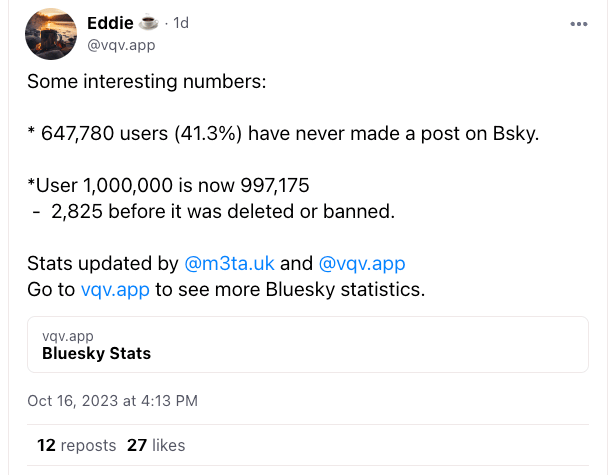 This comes from @qv.app, who runs the very handy Bluesky statistics page. According to their metrics, almost half of Bluesky users, of which there are only about a million, have never posted before. Which is a pretty wild number.