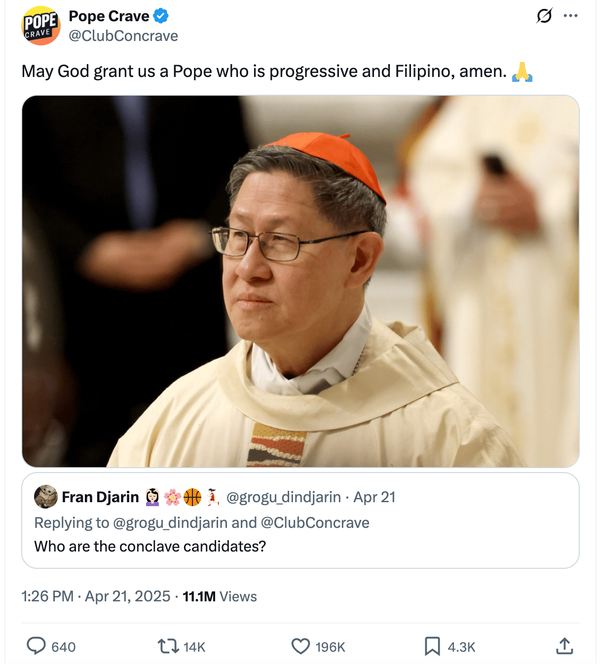 Pope Crave, the Pop Crave parody account created by a fan of the film Conclave, has gone all in on the actual conclave happening right now to decide the new head of the Catholic Church. The memes btw are very good. Pope Crave officially endorsed Cardinal Luis Antonio Tagle, a progressive priest from the Philippines, who has quickly become one of the internet’s favorite papal candidates. People also really like Archbishop Pierbattista Pizzaballa, because he’s fairly liberal, as well, but, mostly because he’s an Italian guy who’s last name is literally “pizza”.