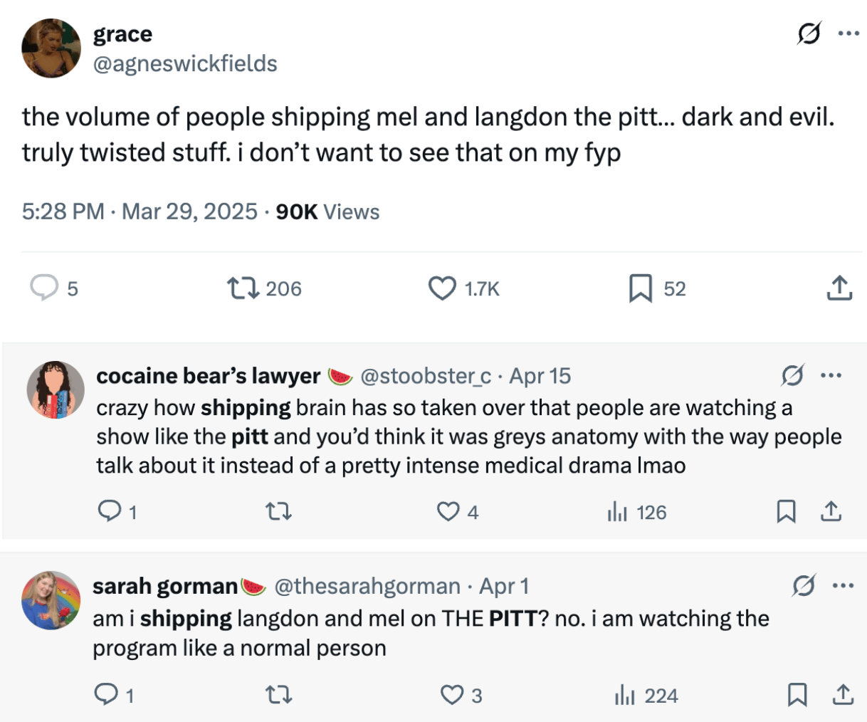 But The Pitt is not a traditional “fandom” show per se — it’s not “genre” in the sense that Our Flag Means Death was. It’s a show that is effectively about normal people, which may be why the hornyposting from Pitt fans feels so odd on your feed. They’re writing breathless fanfic about just, like, people in Pittsburgh, not pirates or wizards or whatever. And The Pitt has attracted a very active and, seemingly, very young fandom that has basically been in perpetual meltdown mode since the beginning of the year as they debate a very odd question for a fandom to ask: Is shipping bad?