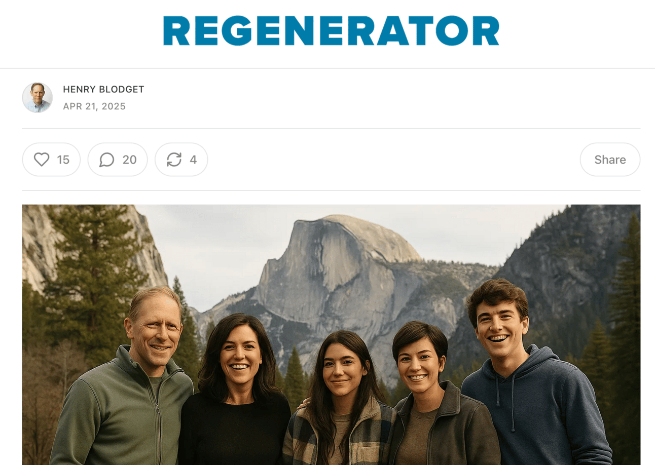 Former Business Insider CEO Henry Blodget announced that he’s started a new media project called Regenerator, which is not just a terrible name, but, it turns out, also a terrible idea. Blodget wrote about it over on mid-life crisis blogging platform Substack, and explained that he’s creating a “native AI newsroom.” Blodget said that he plans to eventually hire “humans,” but, for now, has a team of AI personalities he’s using to get the company off the ground. The image above is, apparently, Blodget and his AI team at Yosemite 😕 But wait! It gets so, so, so much weirder.