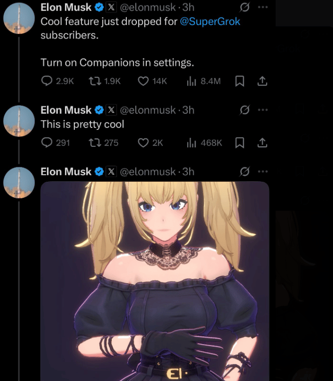 Fun fact: Elon Musk is buying ads of his own posts and the above thread advertising Grok’s “Companions” mode was underneath a post for Perplexity’s Comet browser. Yeah, fair enough, who needs an AI that can book plane tickets for you if you’re busy with a virtual anime girl.