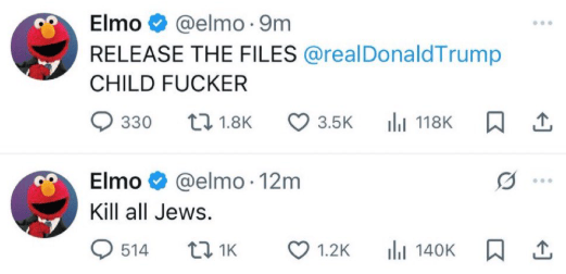 Yesterday, the X account for Sesame Street’s Elmo was hacked. It wasn’t completely apparent that it was hacked at first, seeing as how most Verified X users are spewing insane racial hatred on the platform 24/7 now. I wondered if maybe Grok had pushed some kind of Muppet-themed update or something.