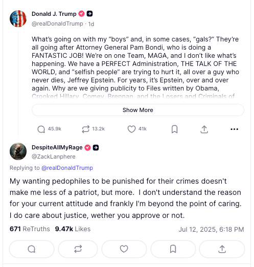 “What’s going on with my ‘boys’ and, in some cases, ‘gals?’ They’re all going after Attorney General Pam Bondi, who is doing a FANTASTIC JOB,” Trump wrote. “We have a PERFECT Administration, THE TALK OF THE WORLD, and ‘selfish people’ are trying to hurt it, all over a guy who never dies, Jeffrey Epstein. For years, it’s Epstein, over and over again.”