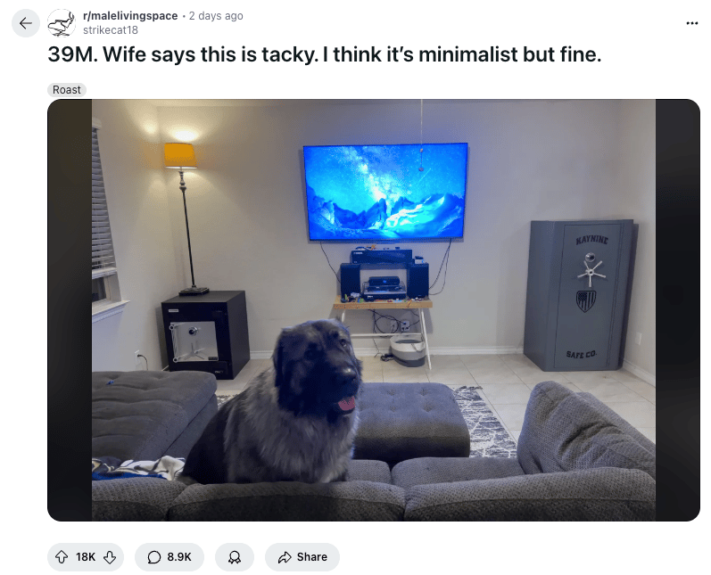 A user on Reddit’s always-excellent r/malelivingspace asked the community over the weekend what they thought about the multiple safes that he was keeping in his living room for some reason. And the general consensus was, as the top commenter wrote, “Yeah looks like shit brother 👍”