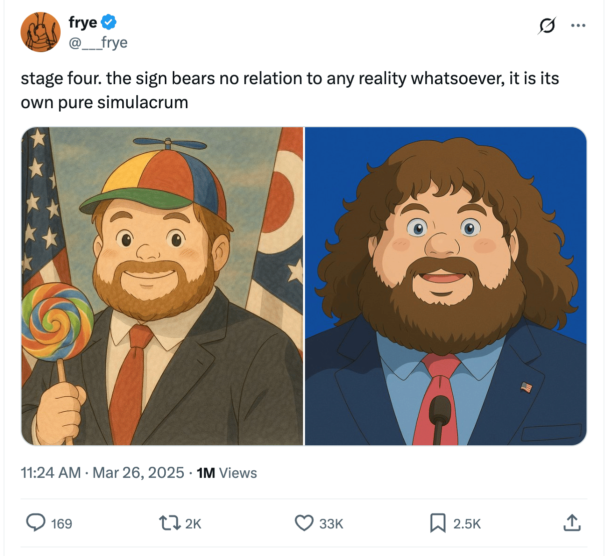 The invasion of AI Ghibli art seems like it finally peaked over the weekend. On Friday, we wrote that it was worth trying to time out exactly how long the trend would last because we still don’t exactly know what the value or impact of an AI-generated “meme” is yet. Plus, this one arrived only a few weeks after the rare Vances meme, which gives us a good recent non-AI trend to compare it to. Seems like one week is about as far as it can go. Maybe it was the Israeli Defense Force doing it yesterday that finally ended the party. Or maybe it was the moron that Ghibli-fied scenes from Dune. Media literacy is more important than ever, folks. Meanwhile, it seems like rare Vances are going to flare up every time the vice president does something cringe and he seems pathologically incapable of not being cringe.