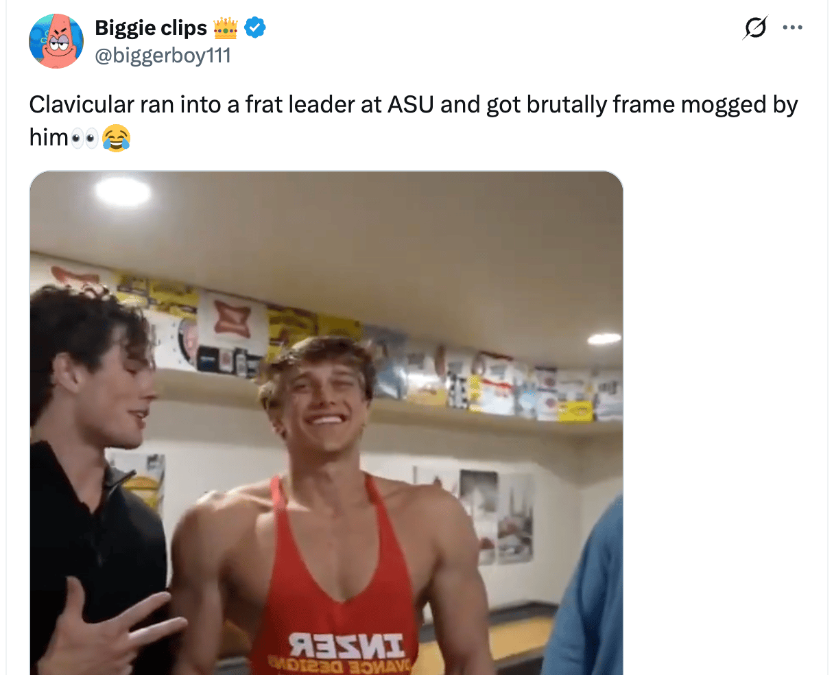 In fact, already, video podcasts have proved to be both too much of a slog to make (and watch) and felt too produced to viewers, who always gravitate towards the lowest common denominator online. Which is why most of them have devolved into celebrity chat shows. Meanwhile, we are now inundated with completely unproduced livestream clips of various Gen Z musclemen smizing on sidewalks outside of nightclubs. Most of these clips are being made in the global south, where the small payouts from the platforms are enough to fund a content farm. For instance, the account that famously clipped Clavicular being framemogged by an “ASU frat leader” is called @biggerboy111 and it’s based in Nigeria. Which is why, I assume, that user didn’t know that frats don’t have a “leader” position, it’s called a president, and also didn’t know/care that Varis Gilaj, the guy mogging Clavicular in the video, isn’t in a frat at ASU.