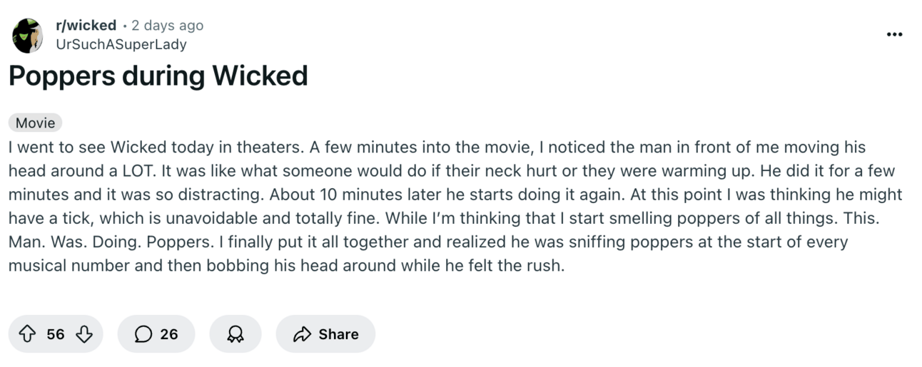 A redditor noticed someone in their Wicked screening who appeared to be huffing poppers before every song. Garbage Day is pro-singing during Wicked, but we are not pro-huffing drugs in public during Wicked. Also, I saw it last night and there were a few people quietly singing in the audience (maybe even me 😌) and it was actually a lovely experience.