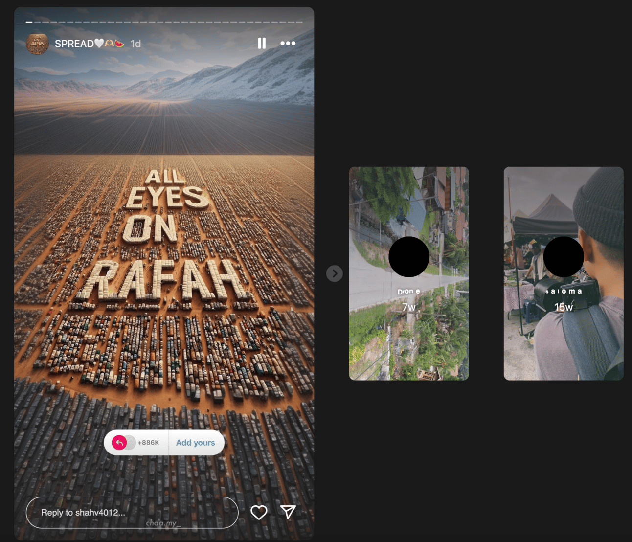 According to Mashable, the original “All Eyes On Rafah” image was posted by an Instagram user named shahv4012. Based on what I can tell from their account, they’re a young photographer based in Malaysia, who has been keeping a running Instagram Story full of pro-Palestine resources. Shahv4012’s story is a mix of AI-generated images, cartoons, memes, screenshots of tweets, and Malaysian-language summaries of developments in Gaza.