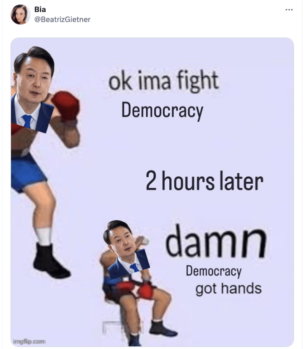 On Tuesday night, South Korean President Yoon Suk Yeol declared martial law. The military swarmed the country’s parliament and clashed with protesters and even lawmakers, who had to effectively break into the building to vote down the resolution. If you’re looking for a greatest hits from the protests that followed Yoon’s attempted coup, here’s a video of Lee Jae-myung, the leader of the Korean Democratic Party, livestreaming himself scaling a wall of a military barricade, another video of a riot cop getting spun around by a protester lol, and a video of Democratic Party spokesperson Ahn Gwi-ryeong seizing a cop’s gun and scolding him like a big dumb baby.