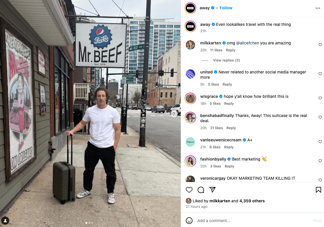 The head of Away’s social team told Karten that “cultural relevance is their North Star.” Alright then lol.