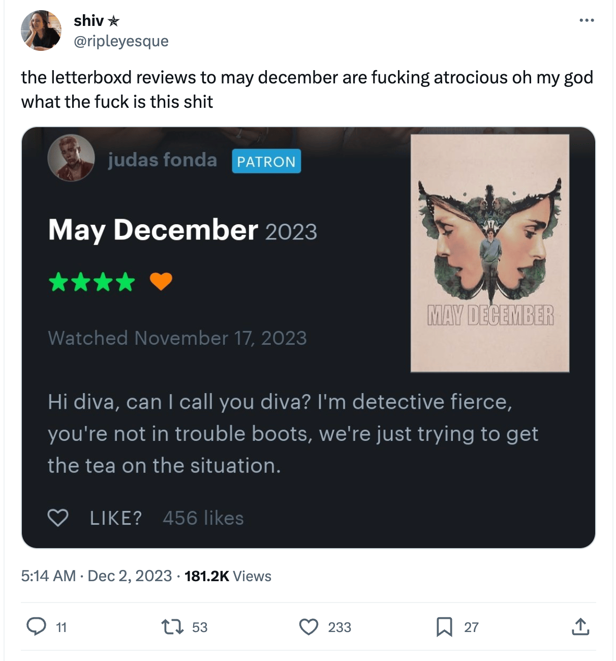 And so, within that framework, the memes about May December taking over sites like Letterboxd right now act as a extension of that process. They, at least, set up me up for the eventual gut punch before the movie even began.