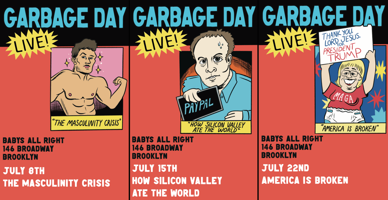 Garbage Day is doing a three-night residency at Baby’s All Right in Brooklyn this July. Tickets are officially on sale. We’re going to try and save democracy in America. Or, at the very least, figure out how we broke it. Each night has a different theme and different guests. You can grab tickets for each night by clicking the links below.