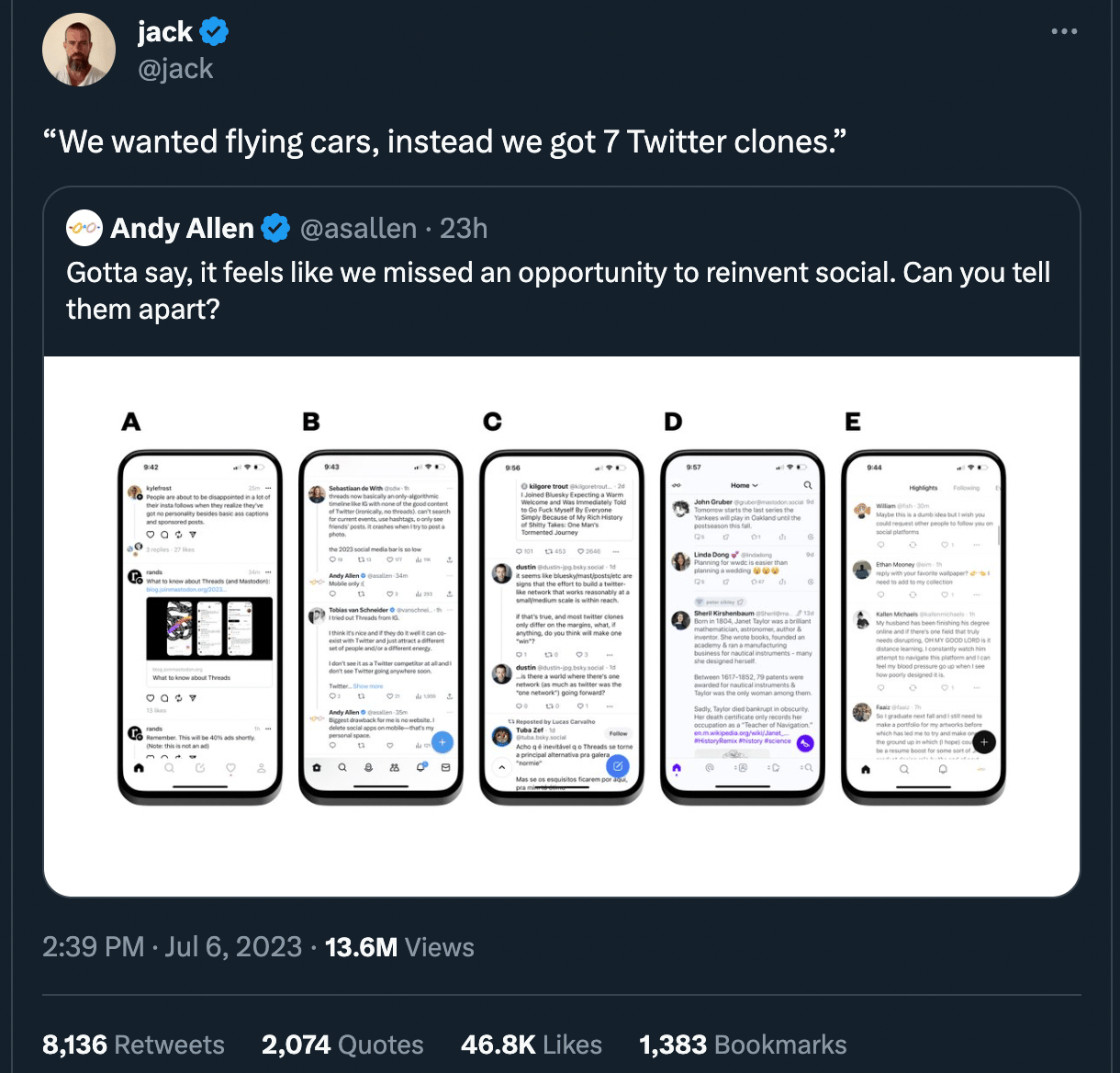 And now we have Threads. Meta clearly dusted off their “kill Snapchat” playbook to launch it because, just as they did with ephemeral stories in 2016, Meta has taken the surface-level components of a competitor’s platform and ported them over to their network and retrofitted them to run on their algorithm. Comparing Meta to the Borg from Star Trek implies a level of sophistication I don’t think they deserve. Comedy writer Jason O. Gilbert came closer to nailing it, writing this week that, “Threads feels like when a local restaurant you enjoy opens a location in an airport.”