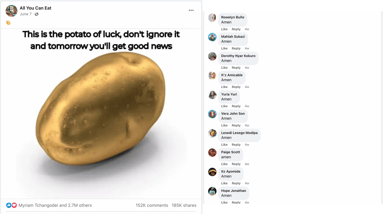 In retrospect, it seems like Jack Dorsey and his, what I like to call, “Burning Man libertarianism” approach to content moderation, was the real secret sauce to Twitter’s cultural cachet from 2015-2021. He was able to balance enough plates with a deft enough hand to keep all the disparate parts of the app in place. You could watch porn. Its hashtags could topple governments. Minorities could put pressure on society’s power structures. Rich people could feel like celebrities and celebrities could feel like artists. And, most importantly, it created a lot of really good memes. Even if everyone was completely miserable. Facebook, over the same stretch of time, became a place for old people to share Ring camera footage and haggle over used furniture. I discovered while putting together this month’s Garbage Intelligence trend report that the fourth-most interacted with Facebook post in June was a picture of a potato shared by an Amazon dropshipping page that users were writing “Amen” underneath.