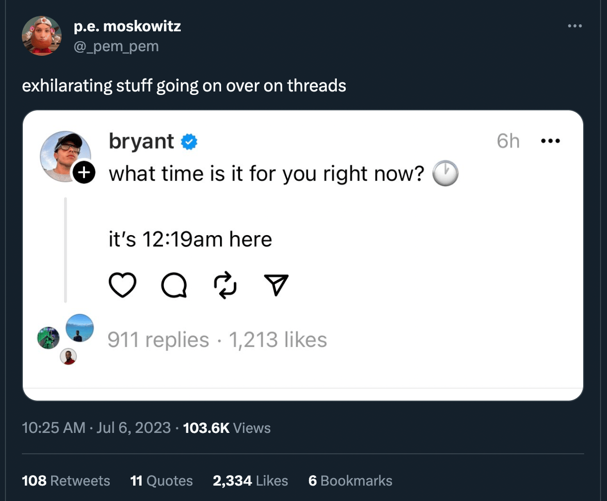 So if Threads does work, it won’t be because it has toppled Twitter, but because it toppled Instagram. And there’s no reason to think it couldn’t — it supports a gallery of 10 images and short-form videos and runs on a near-identical algorithm that rewards the exact same kind of brand-safe vaporposting. And Meta won’t care either way as long as they’ve got a bunch of signups.