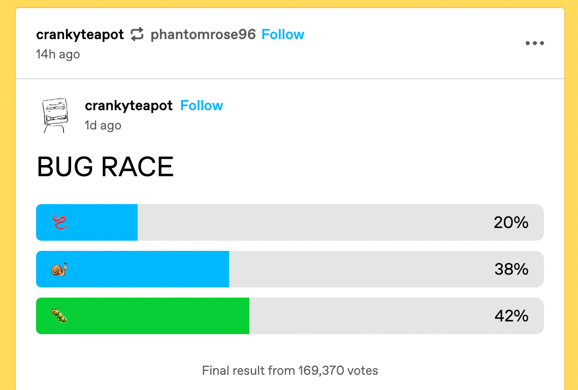 Tumblr has polls now. Naturally, Tumblr users have used the new poll feature to make three bug emojis race. There’s a whole tag for the bug race. “So cool that polls arrived and immediately on day one they ushered in a whimsical playground spectator sport for us all to enjoy together,” Tumblr user duckdotcom wrote.